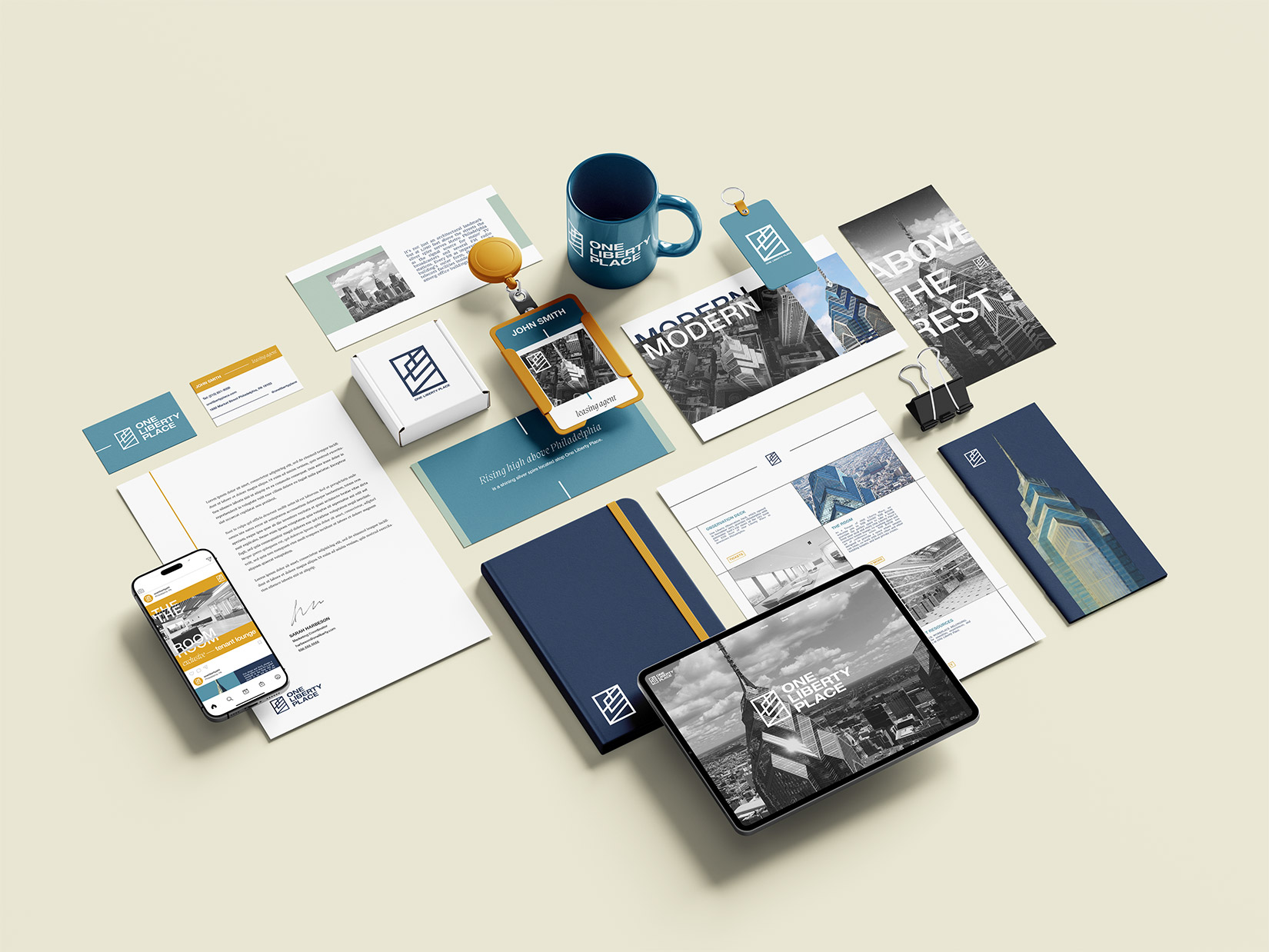 A rebranding project done on Philadelphia’s One Liberty Place, the trophy tower of Philadelphia’s skyline. With a focus on giving the building a modern brand that matches it’s sleek presence in the city, the geometric logo references the iconic architecture and the color palette compliments the look of the building in the skyline.
